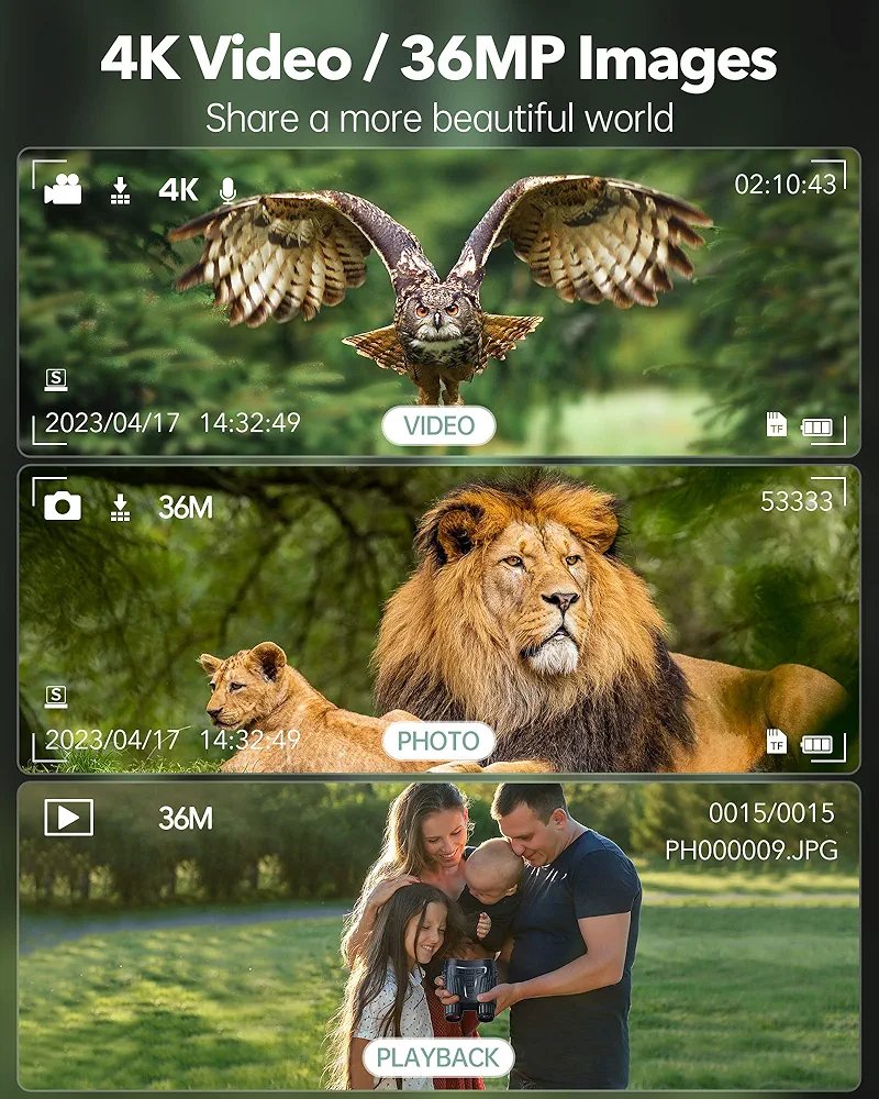 Night Vision Scope: 1. Built-in 2,600 mAh battery, can be used for a long time. 2. The 3.2-inch LCD screen provides a wider field of view. 3. It has an 8x digital zoom, so you can zoom in and zoom out. 4. 4K shooting 36MP image for clear vision. 5. The IR mode can be adjusted to 7 levels, providing a comfortable experience for your eyes. 6. Waterproof IP54 level, safe to use. 7. Comes with a playback function so you can check it immediately. 8. Includes 32GBsd card