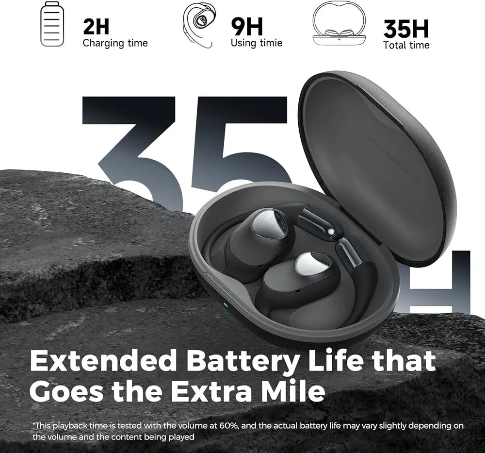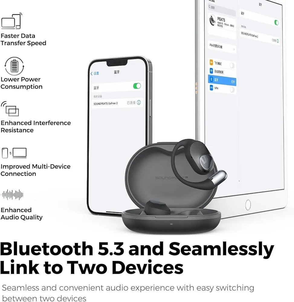【Up to 35 Hours of Playtime】SoundPEATS GoFree 2 air-conduction running headphones with a microphone provide an impressive 9 hours of playback on a single charge, with an additional 35 hours offered by the compact charging case. Fast charging refills the case in just 2 hours via a USB Type-C cable. Please note that actual charging times may vary depending on usage, Bluetooth codec, and audio volume.