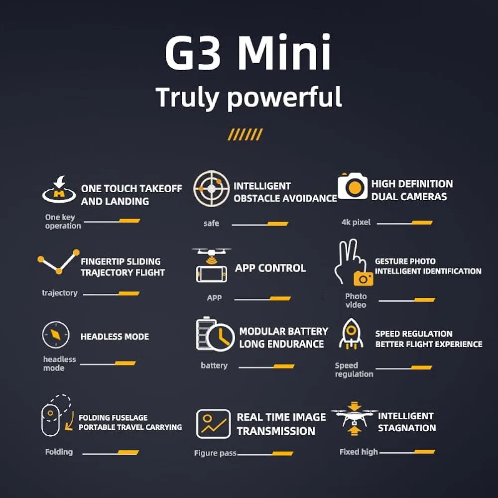 Intelligent Obstacle avoidance “Worry Free Flight”. G3 Mini has three-Dimensional infrared Obstacle avoidance. It can sense obstacle and avoid them automatically, making it Easier for you to fly.